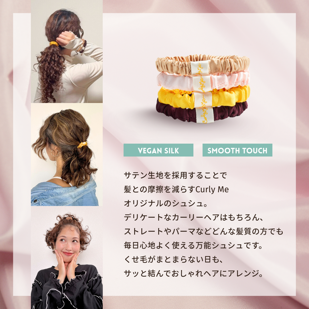 サテン生地を採用することで髪との摩擦を減らすCurly Meオリジナルのシュシュ。