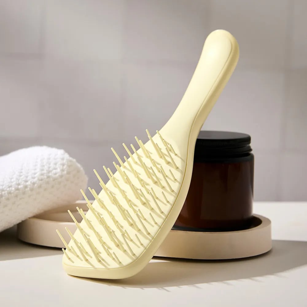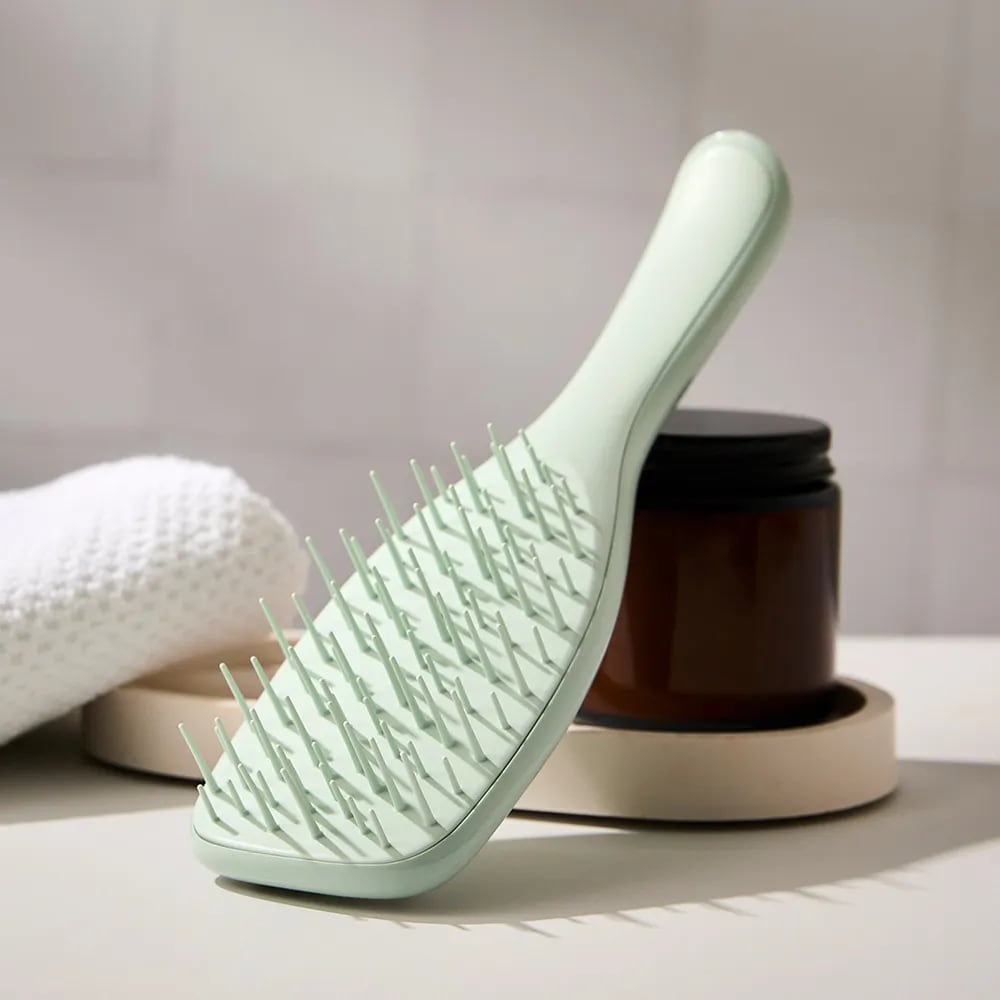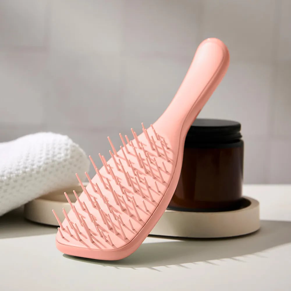 両サイドの広い間隔が髪を自然に中央へ集め、中央の密集配列が絡まりを解きほぐすことで、少ない力で無理なく整えられる構造になっています。